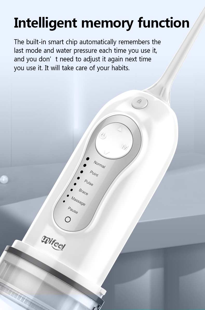 6 različnih vodnih curkov in 8 različnih jakosti. Načini Normal, Point, Pulse, Brace, Massage in Pause z nastavljivim vodnim pritiskom jakosti 30–120 PSI lahko zadovoljijo različne potrebe po ustni negi. Inovativna pomnilniška funkcija pa pomaga pri beleženju vašega najljubšega načina za naslednjič.